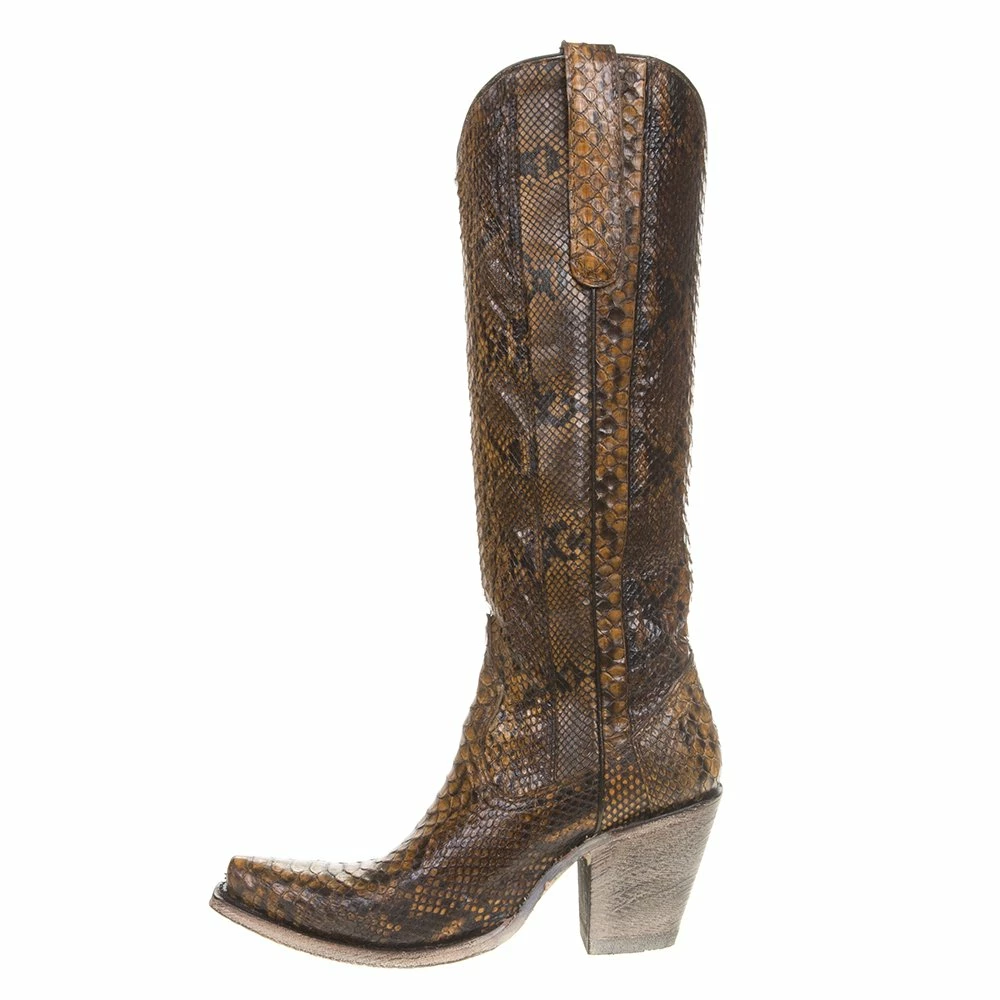 Ladies dress up your look with our tan full python 15″ tall snip toe boot from Corral Boot Company.Â