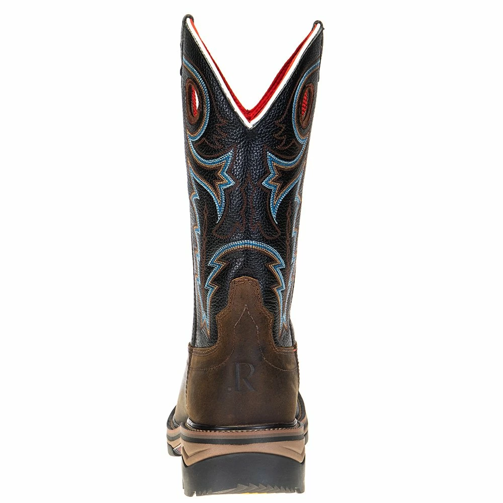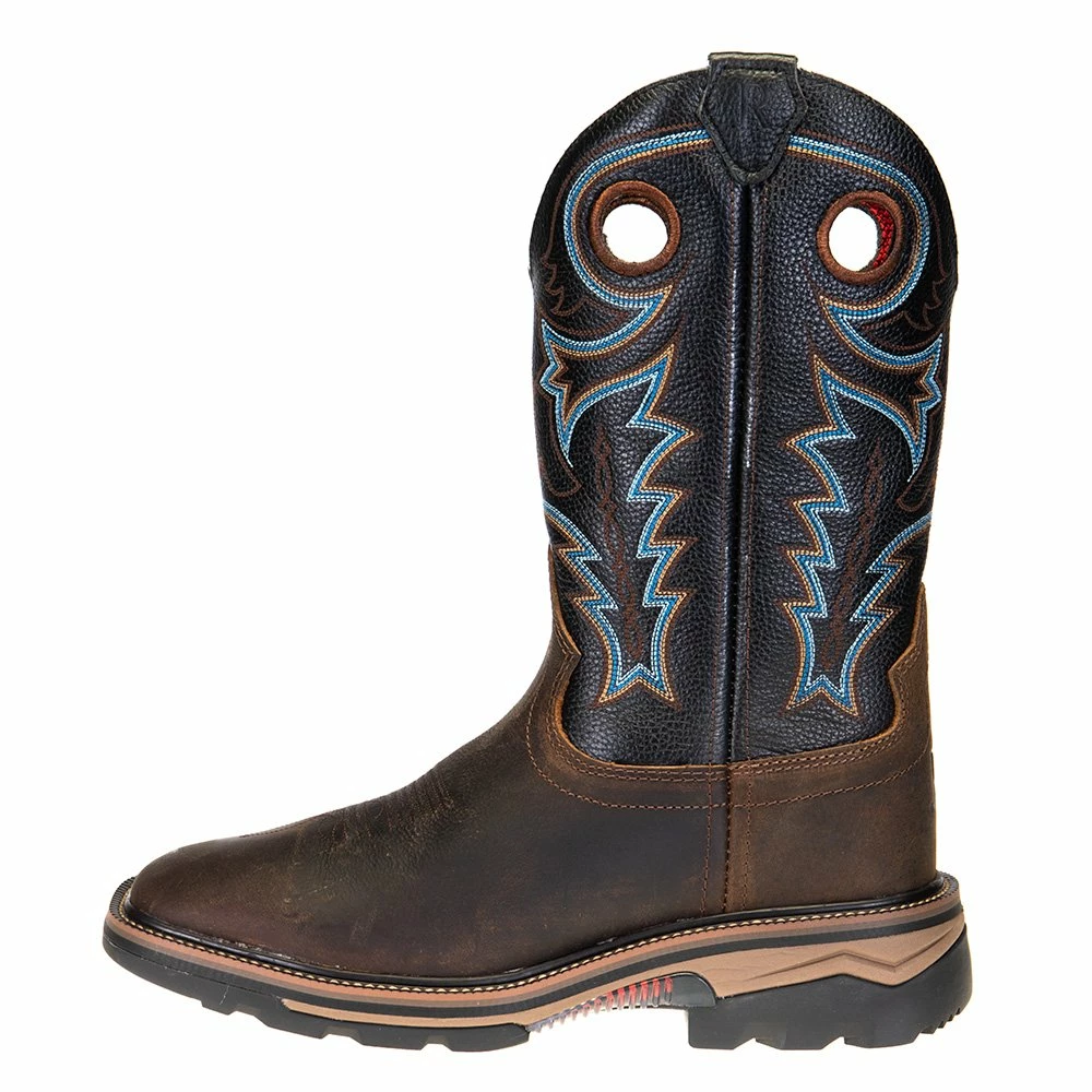 R. Watson presents these coffee distressed buffalo and midnight black goat top soft toe work boots. These work boots have a 10 row stitch pattern, pull holes, removable orthotic insole, EVA midsole and a block heel. They are EH, slip and oil resistant. 12″ total in height.