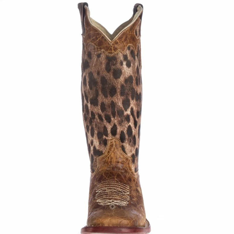 These Ferrini Brushed Tan Cowgirl Boots look like the typical riding boot, but pull your jeans up a little bit and its all attitude! These chic cowgirl boots have modern details witha southern feel. Made of high grade leatherconstruction, this bootoffers a brushed tan cowhide leather vamp and collar, 12″ Acero leopard print leather top, leatherlining, and cushion insoles.
